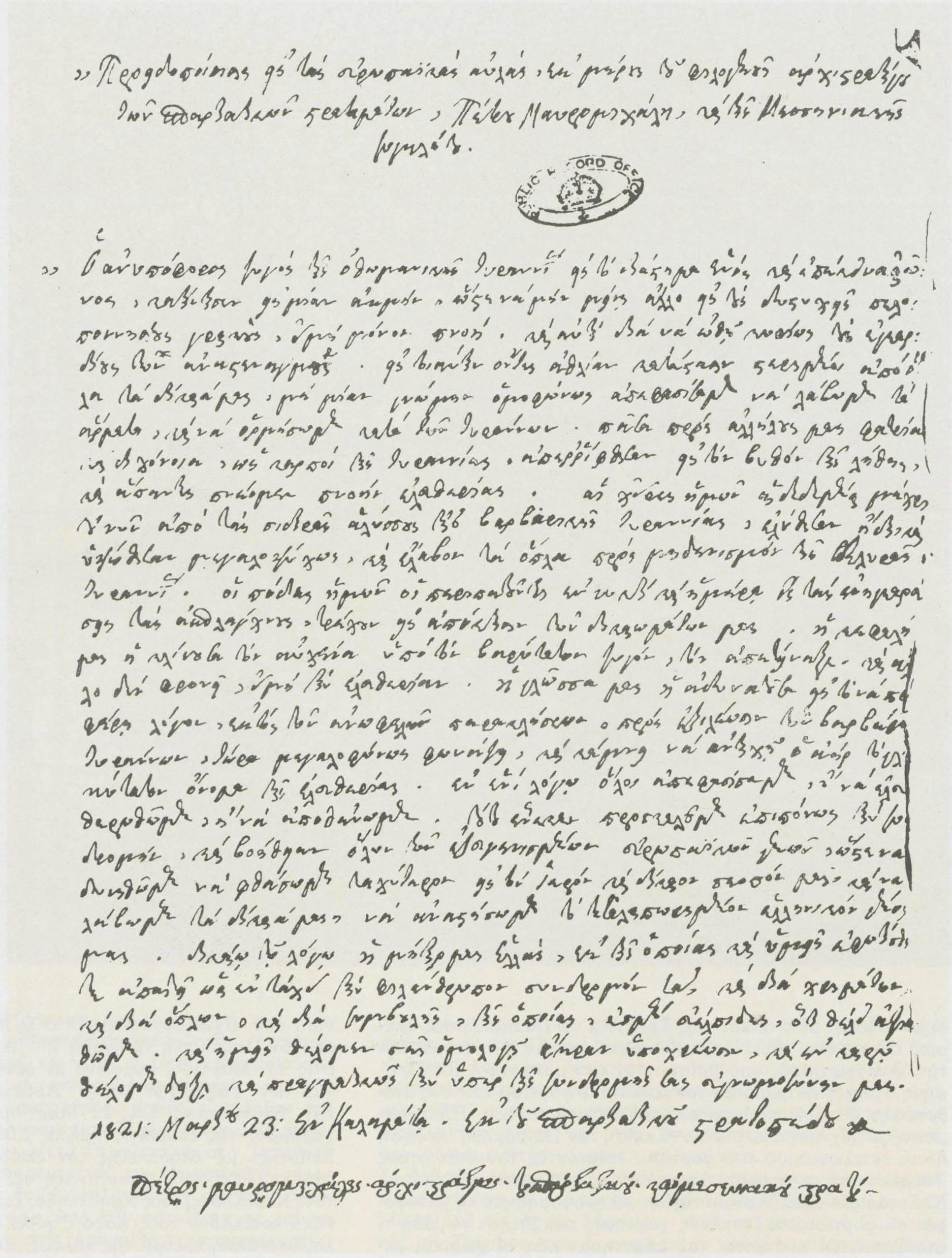 «Εδώ και πάνω από έναν αιώνα, ο λαός της Πελοποννήσου στενάζει υπό την τυραννία των Τούρκων. Αυτή η τυραννία έχει γίνει όλο και πιο καταπιεστική, και τελικά μας έχει αλυσοδέσει τόσο ώστε μόλις να μπορούμε να αναπνεύσουμε αρκετά για να εκφράσουμε τις κραυγές μας. Η απελπισία μας έχει κυριεύσει, και εμείς, με μία φωνή, έχουμε πάρει τα όπλα για να αποτινάξουμε το ζυγό της δουλείας. Αμέσως φυτεύτηκαν οι σπόροι της διάλυσης, την οποία ο Δεσποτισμός διαρκώς ενισχύει ανάμεσά μας, καταστρέφοντας από τη θανάσιμη επιρροή της ελευθερίας.