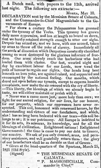 Η Προκήρυξη της Μεσσηνιακής Γερουσίας προς τις Ερωπαϊκές Κυβερνήσεις, υπογεγραμμένη από τον Πετρόμπεη Μαυρομιχάλη, αριστερά όπως διασώζεται στα Βρετανικά αρχεία και δεξιά όπως δημοσιεύτηκε στην βρετανική εφημερίδα Morning Herald στις 15/06/1821.